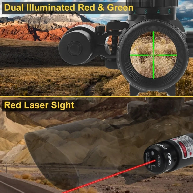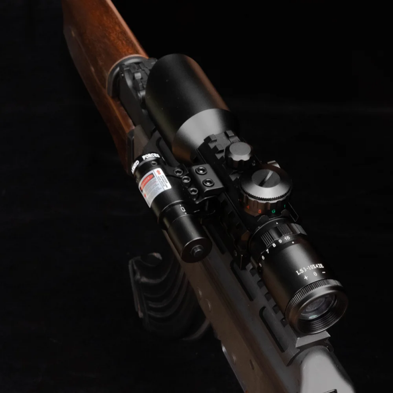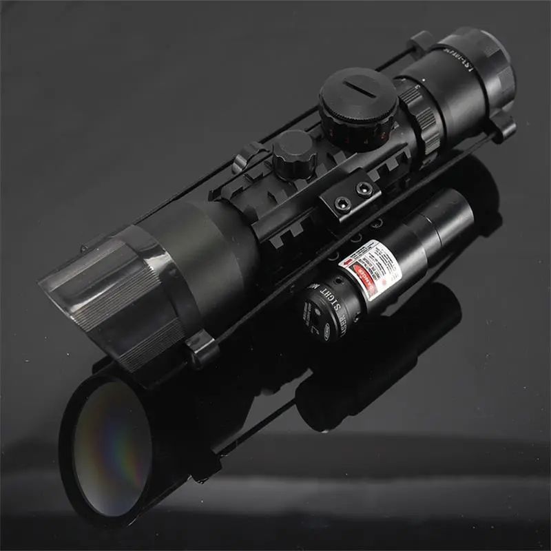 Product introduction: Durable all metal construction High grade fully coated optical lens Weather, fog, and shock proof Integrated rails offer ample space for accessories provides a wide field of view, suitable for normal and rapid-firing shooting of moving targets The net weight: 0.450KG Specifications (Rifle scope) Dimensions:length:210mm Magnification:3x-10x Diameter:42mm Brightness Control Red : 5 levels / Green : 5 levels Reticle:Rangefinder Windage & Elevation Click Value:1/4' @ 100 yards Power:1 x CR2032 (not include) Specifications (Red Laser Sight) Wavelength:625-660nm Reaching Distance:77mm Power:3 x AG13 (NOT included)